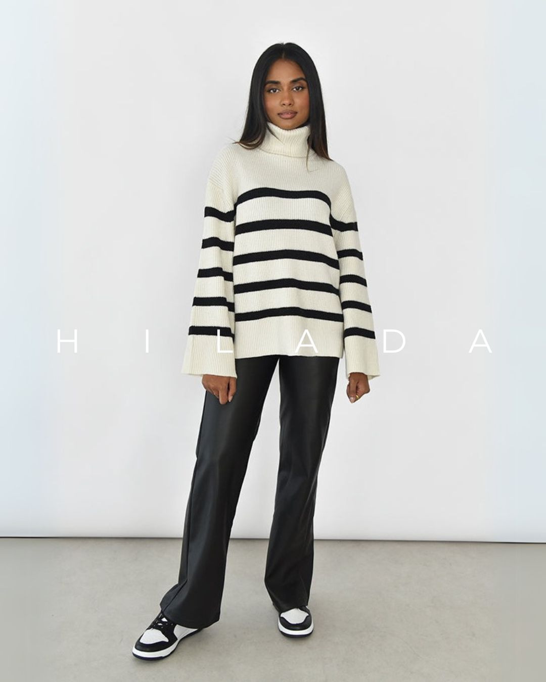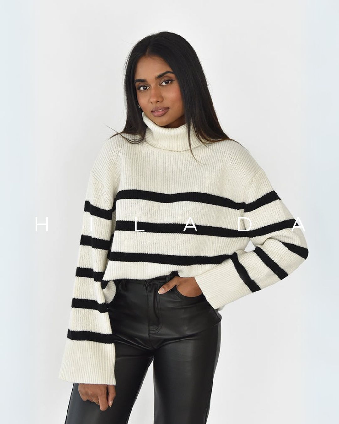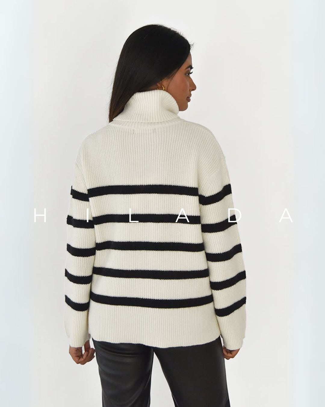 Un básico infalible con estilo propio. Este sweater de hilo con cuello alto y patrón de rayas negras aporta calidez y sofisticación a cualquier look. Su corte recto y mangas ligeramente amplias lo convierten en una prenda cómoda, moderna y muy versátil. Perfecto para usar en días fríos, reuniones casuales, una tarde de café o incluso en la oficina. Combínalo con jeans, pantalones de cuero o una falda larga para un outfit pulido. Ideal para mujeres que buscan sentirse abrigadas sin perder estilo.