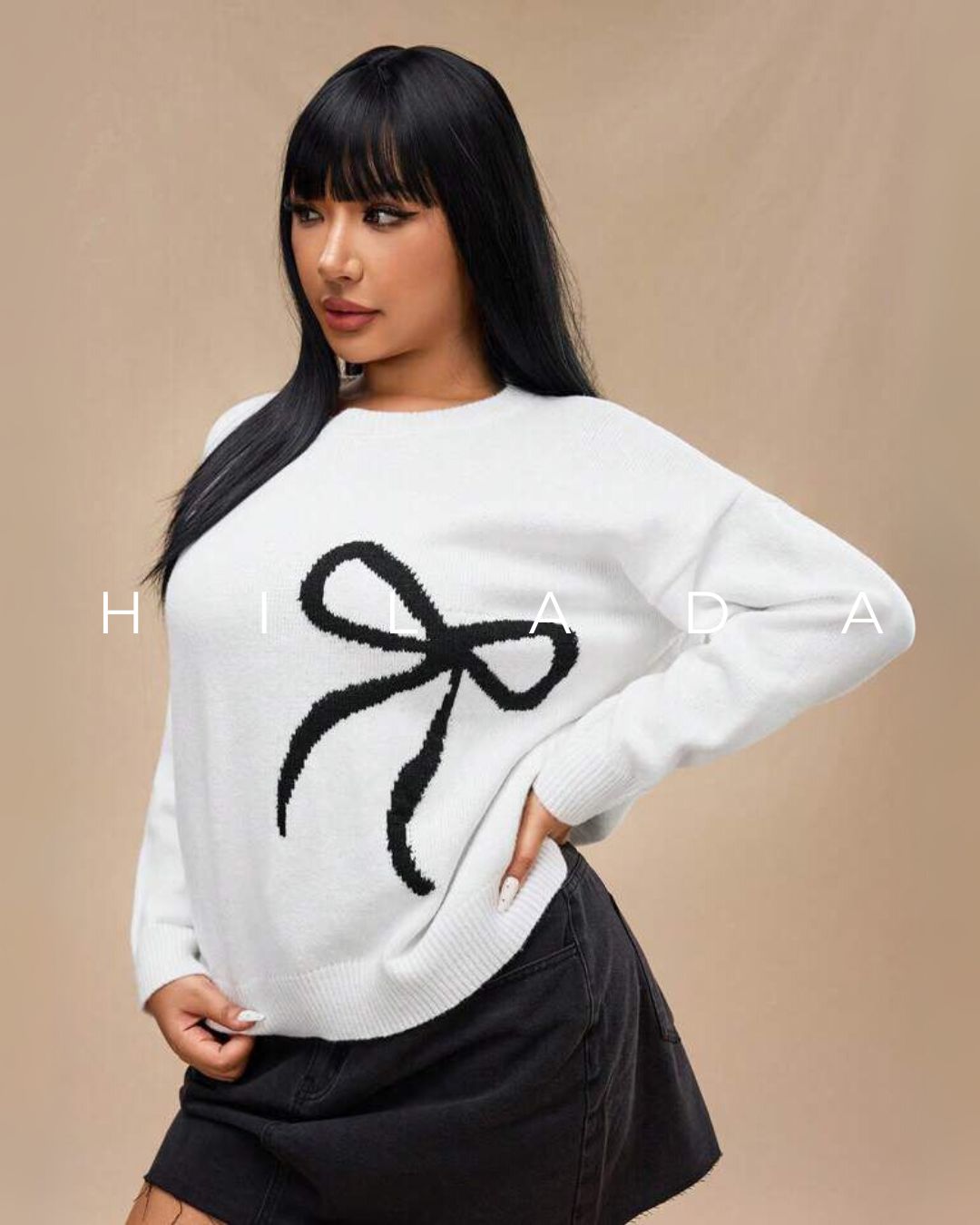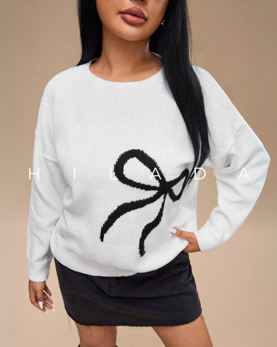 Este suéter blanco destaca por su delicado diseño con un lazo negro tejido que le da un aire femenino y moderno. Confeccionado en un tejido suave y ligero, es ideal para días frescos sin sacrificar estilo. Su corte clásico y cuello redondo lo hacen fácil de combinar con faldas, jeans o pantalones sastre. El diseño minimalista con un toque gráfico lo convierte en una prenda versátil para usar tanto en el día a día como en salidas informales. Perfecto para looks casuales con un aire coqueto. Ideal para otoño o entretiempo. Un básico con personalidad que resalta por su simplicidad.