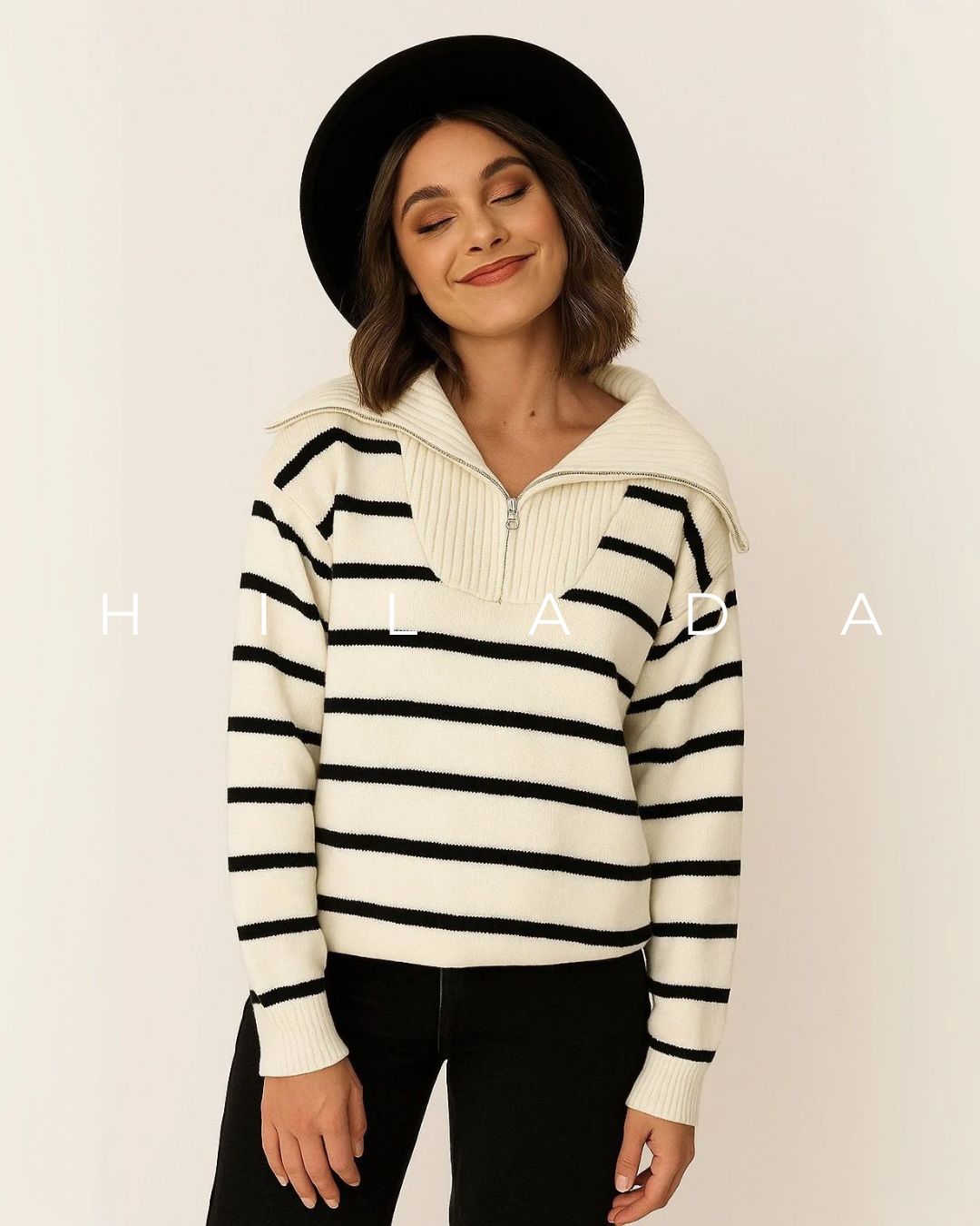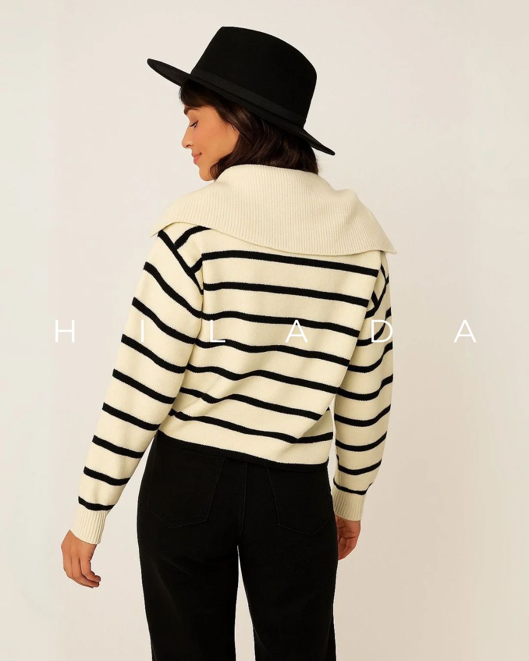 Sweater con cuello estilo marinero y cierre frontal, pensado para destacar. El diseño a rayas le da un toque distintivo y fácil de combinar. Tiene un fit cómodo, con caída relajada y tejido suave al tacto. Versátil para usar con jeans, pantalones o faldas. Funciona abierto o cerrado, según tu estilo. Ideal para salidas, días casuales o simplemente verte bien sin esfuerzo. No limita tu look, lo potencia. Diseñado para adaptarse a ti y a tu ritmo. Una prenda que suma sin complicar.